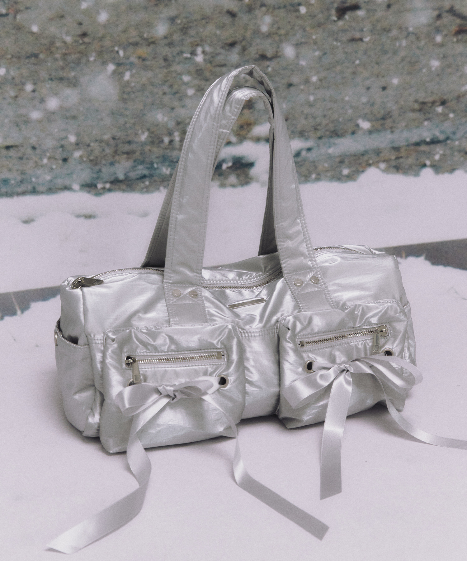 낫노잉 시그니처 아이템인 Double Ribbon Cargo Duffle Bag의 24시즌 실버 컬러 가방입니다.