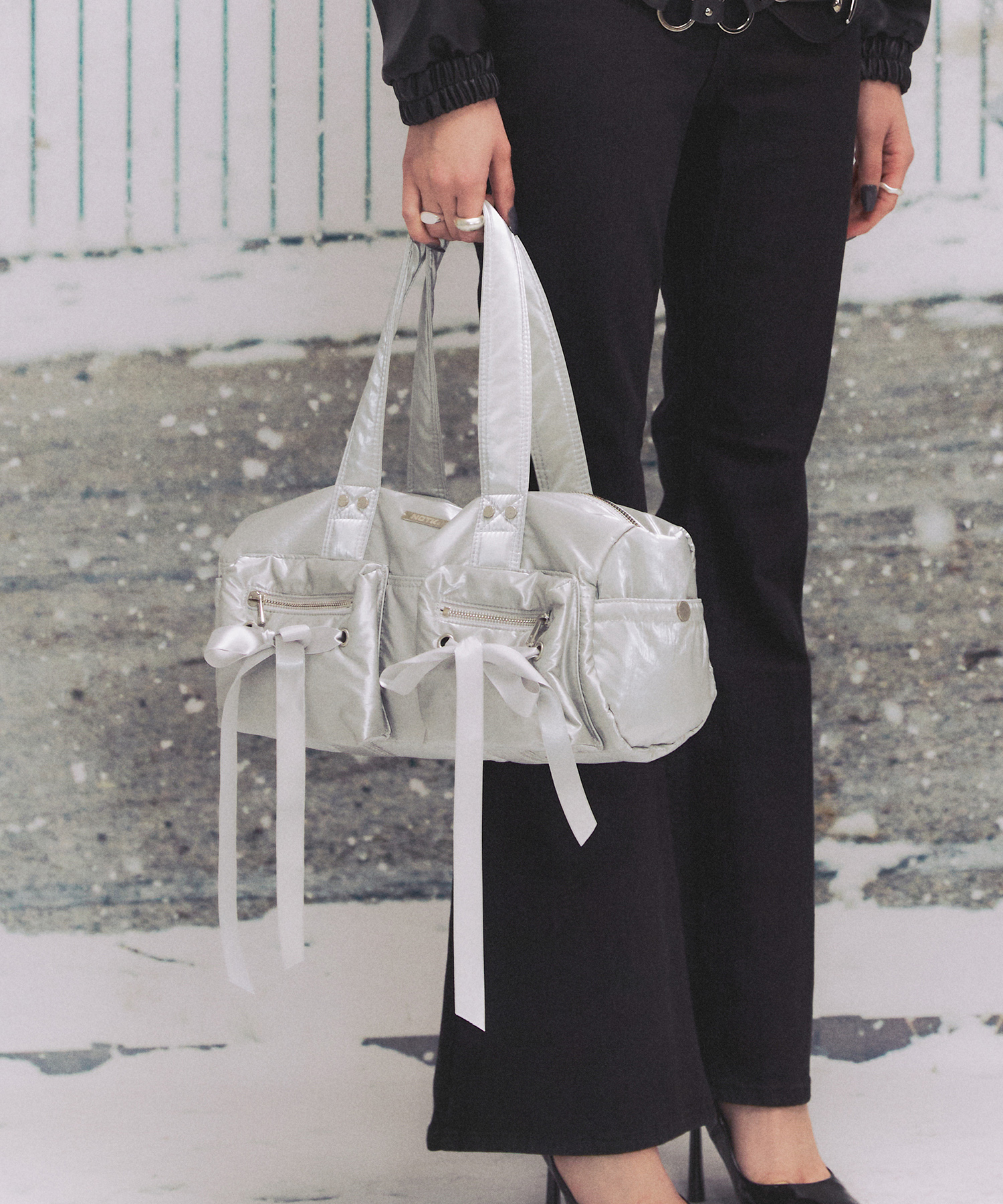 메탈릭한 질감의 PU 나일론 원단을 사용한 더블 지퍼 카고 포켓의 더플백 입니다.
