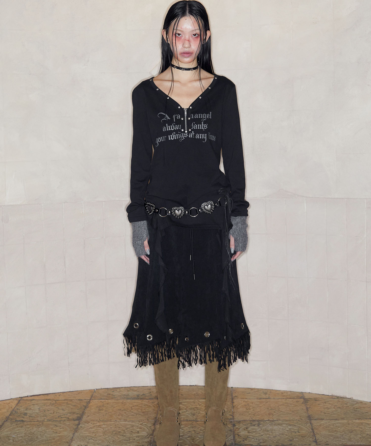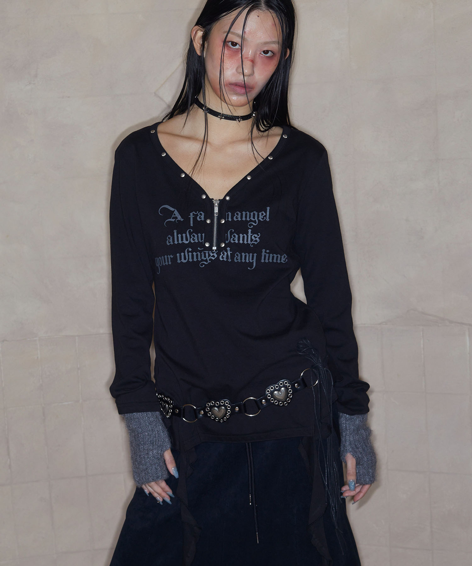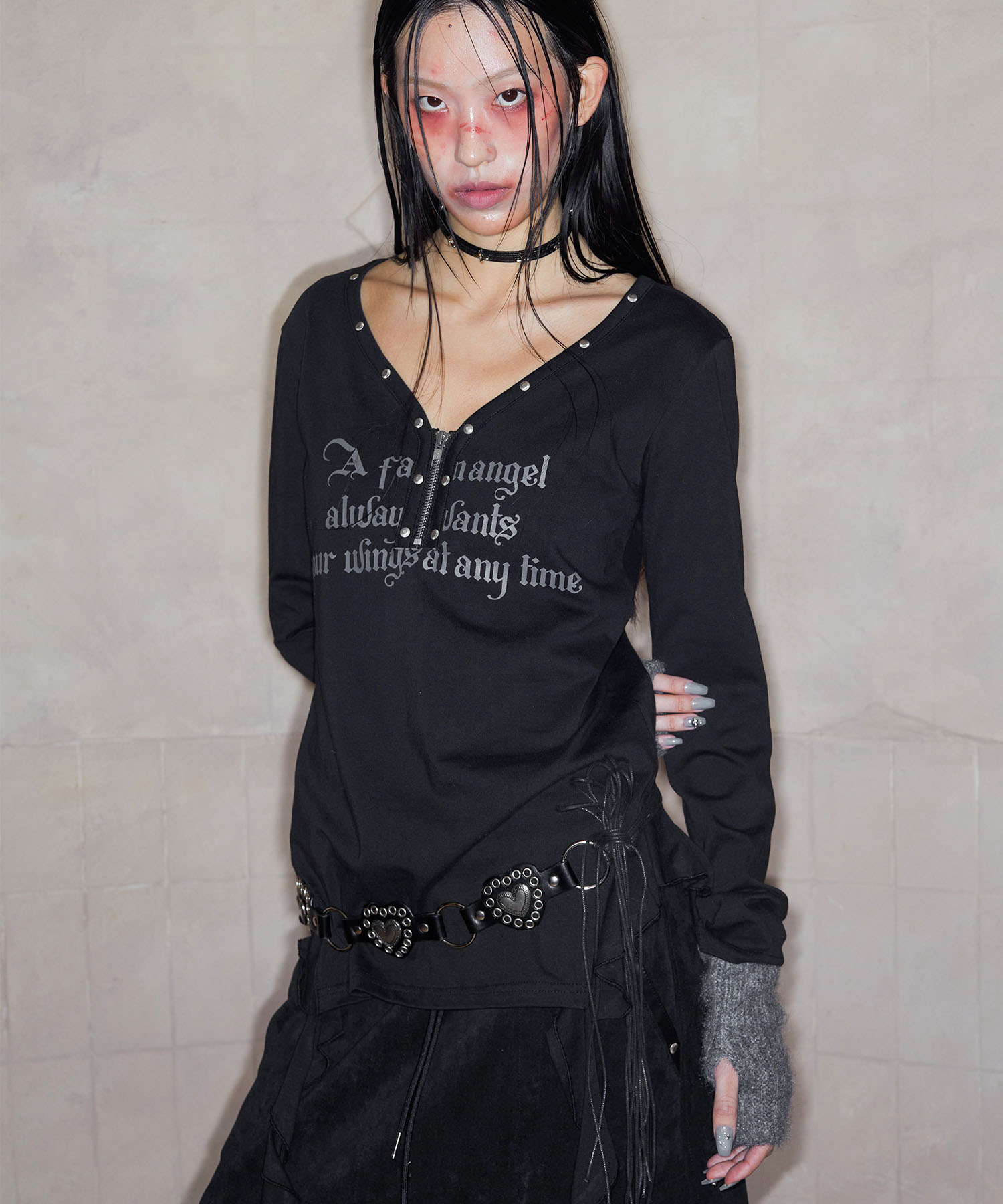- 레터링 그래픽과 스터드, 메탈지퍼, 러플 디테일들로 청키한 무드를 주는 V넥 러플 티셔츠 입니다.