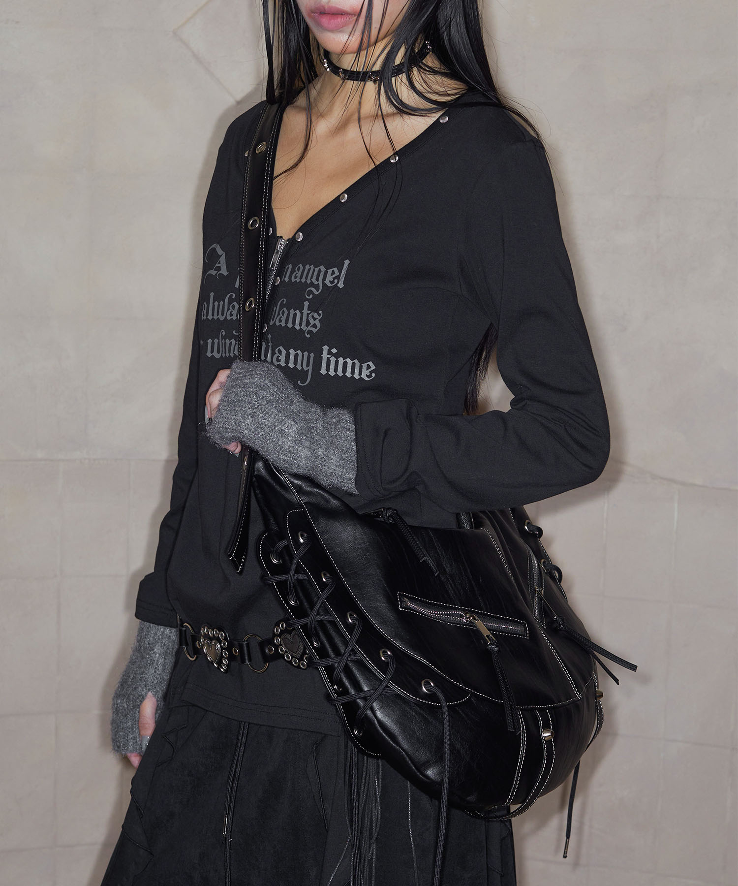 - V넥 라인을 따라 웨스턴 스타일의 실버 스터드를 부착하였고 가운데의 ykk 지퍼를 오픈하여 오프숄더 형태로도 연출이 가능합니다.
