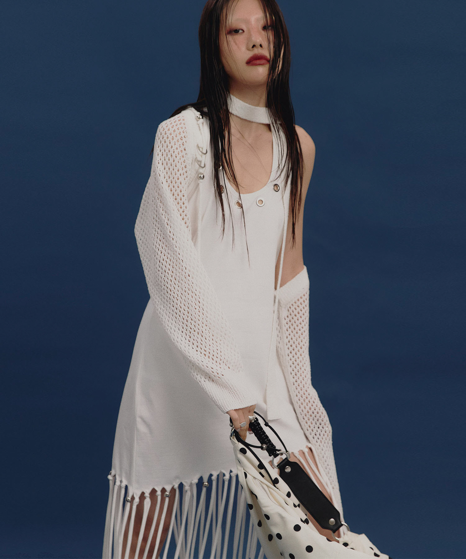 - 넥 앞쪽에는 실버 메탈 아일렛 장식이 포인트로 더해졌으며, 밑단은 사선 방향으로 컷팅된 로우엣지 프린지에 볼 메탈 벨 디테일을 추가해 유니크한 무드를 완성했습니다.