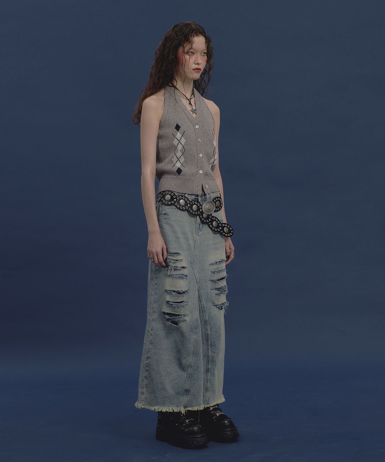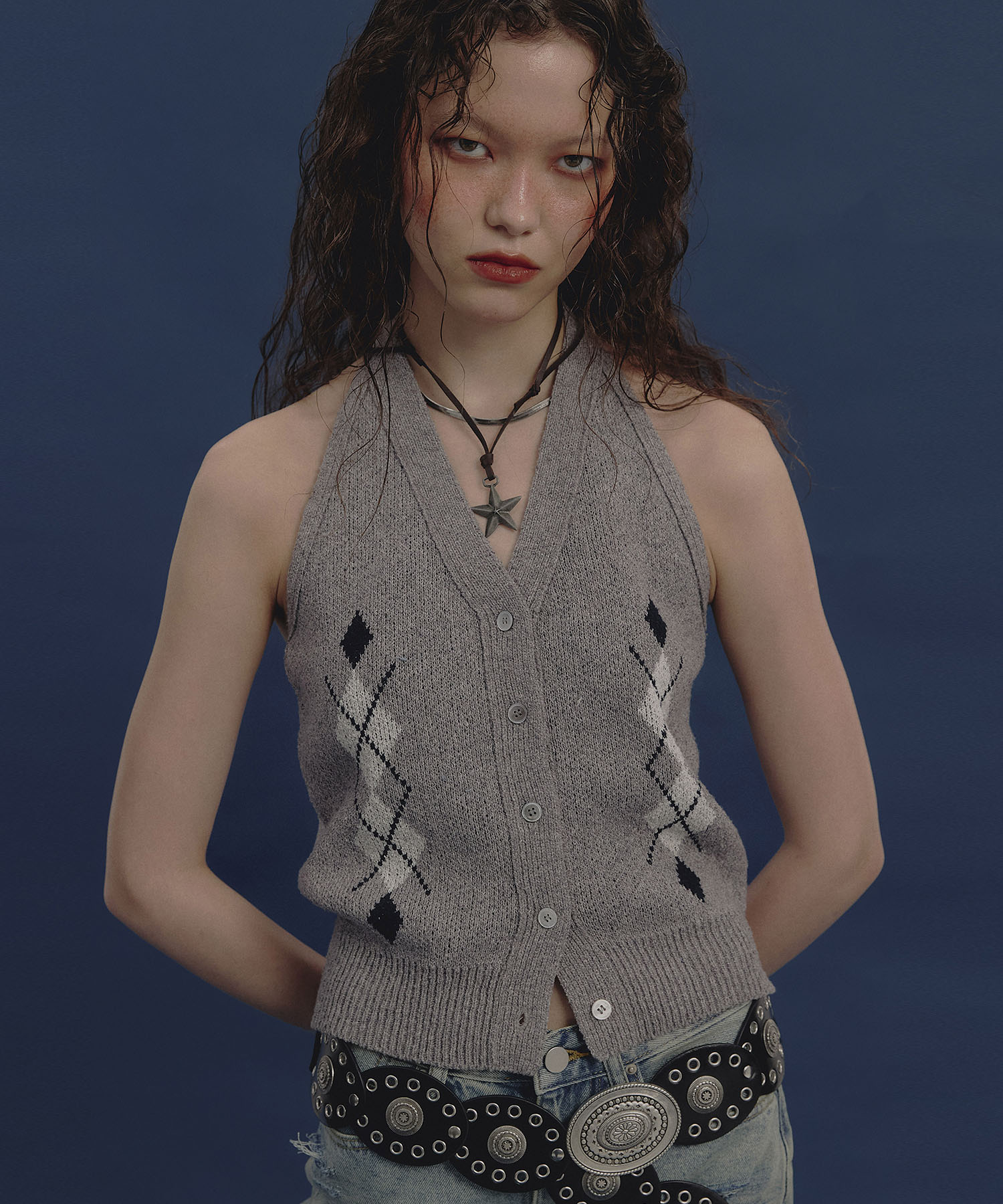 - 쿨한 터치감의 린넨 혼방 원사로 제작된 아가일 홀터넥 니트 탑입니다.