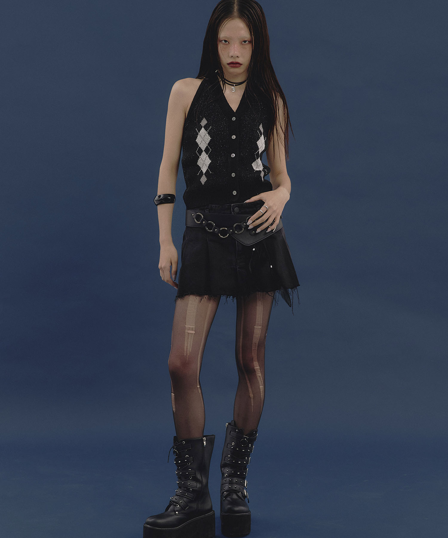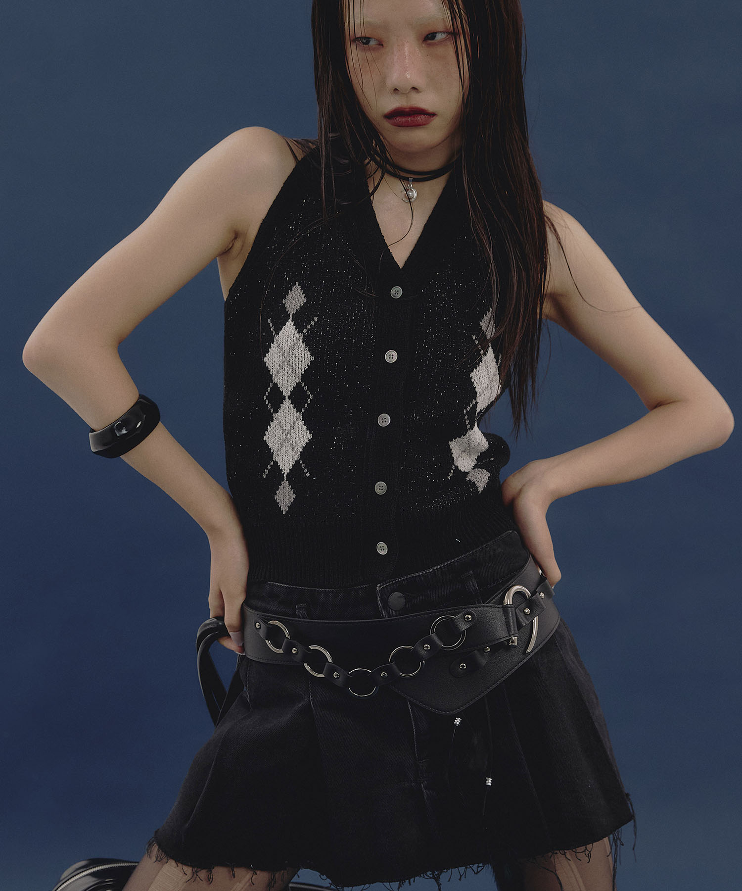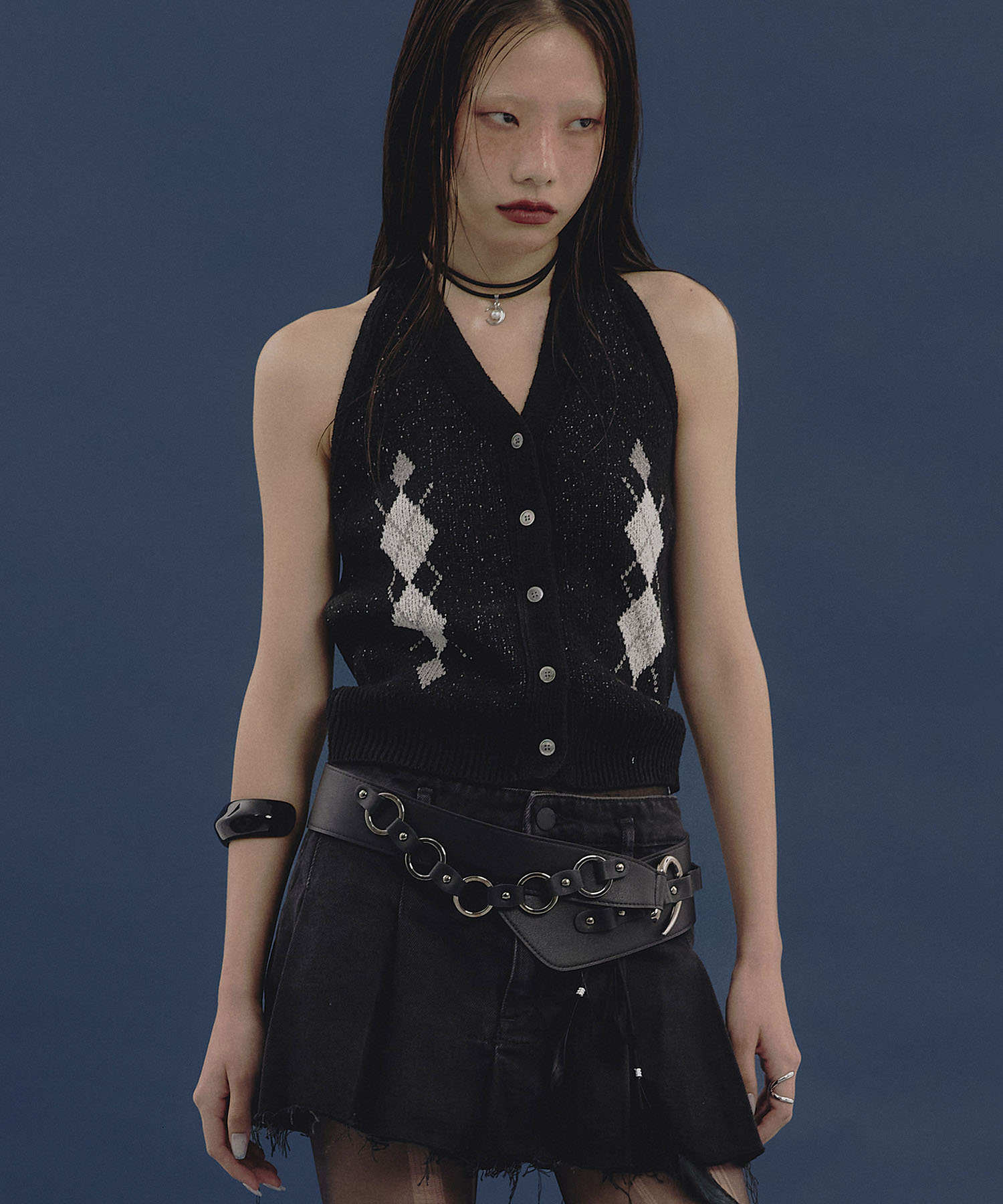 - 쿨한 터치감의 린넨 혼방 원사로 제작된 아가일 홀터넥 니트 탑입니다.