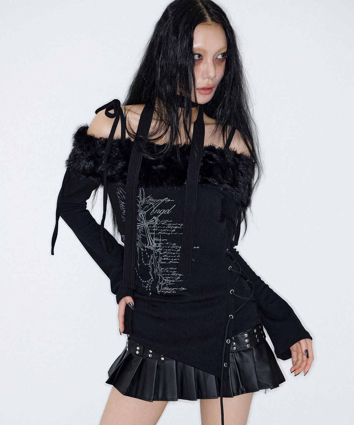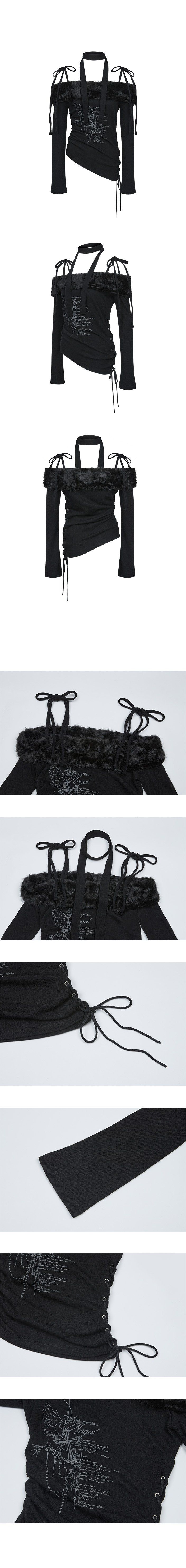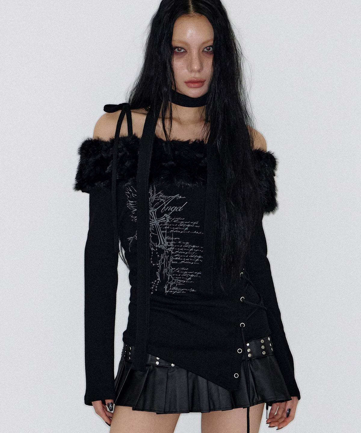 - 두께감 있는 스트레치 바디에 퍼 원단 포인트를 더해 제작한 오프숄더 탑
