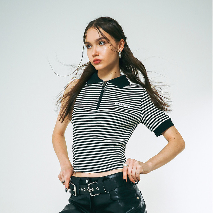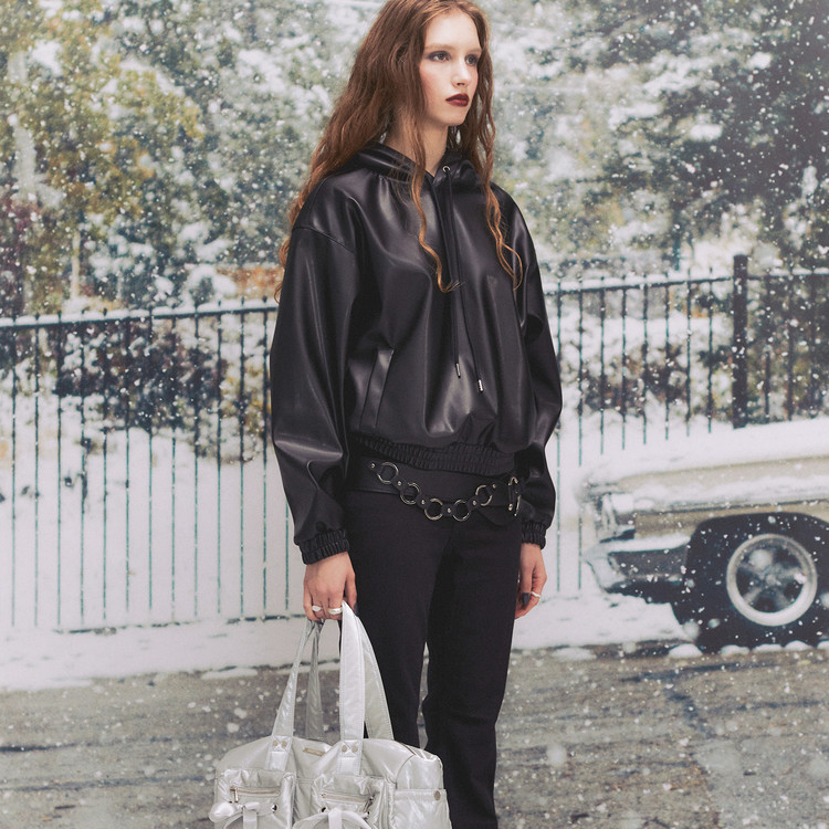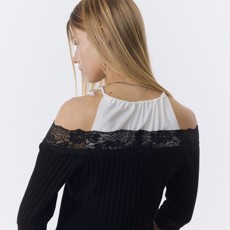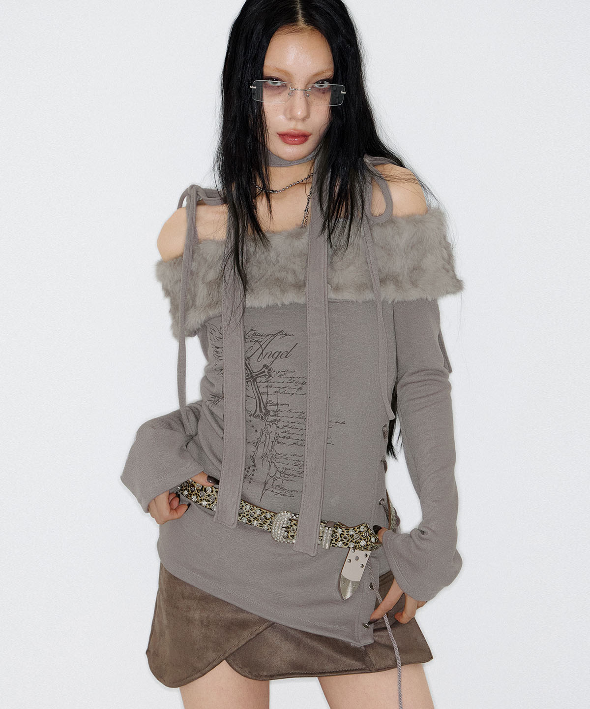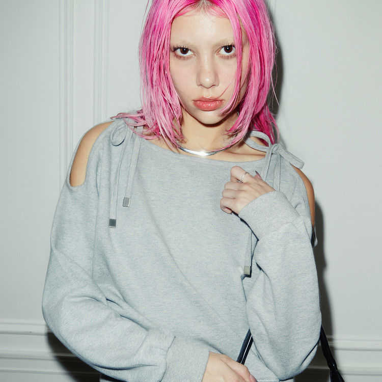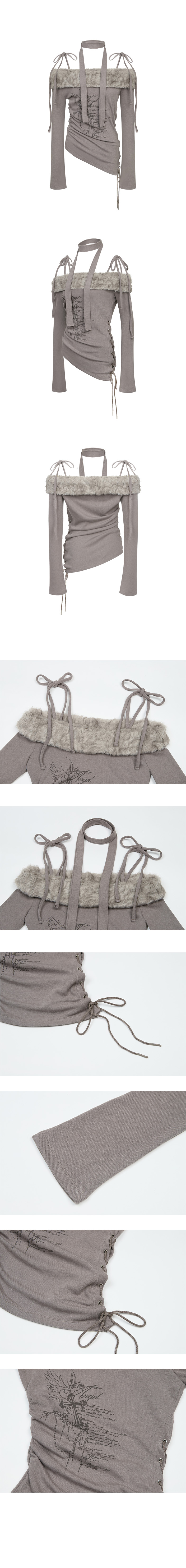 - 두께감 있는 스트레치 바디에 퍼 원단 포인트를 더해 제작한 오프숄더 탑