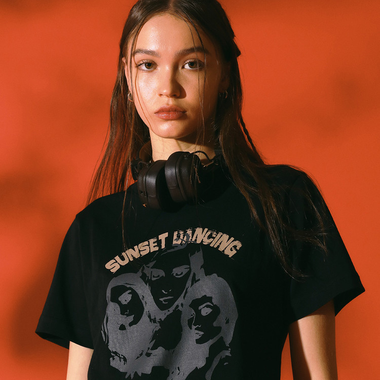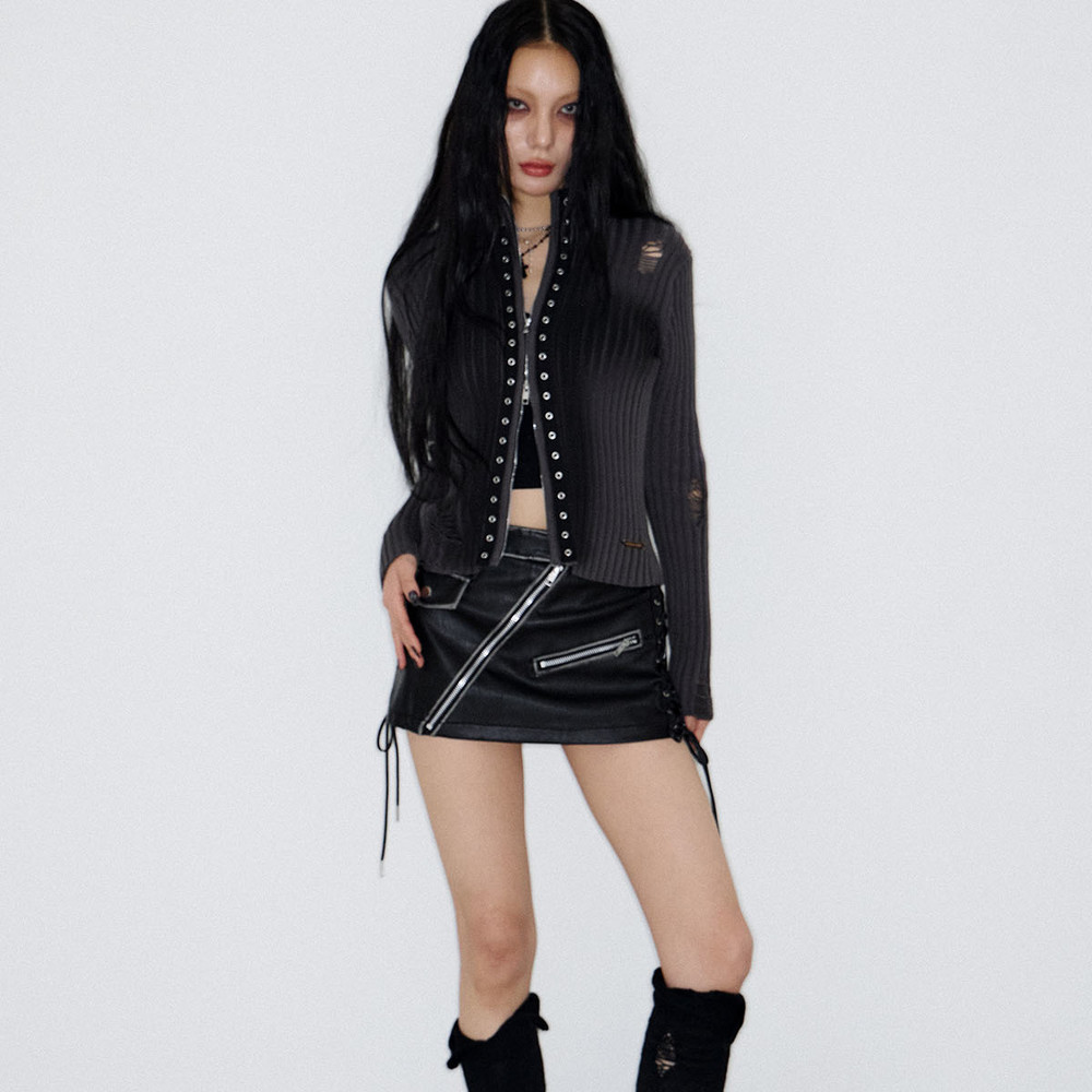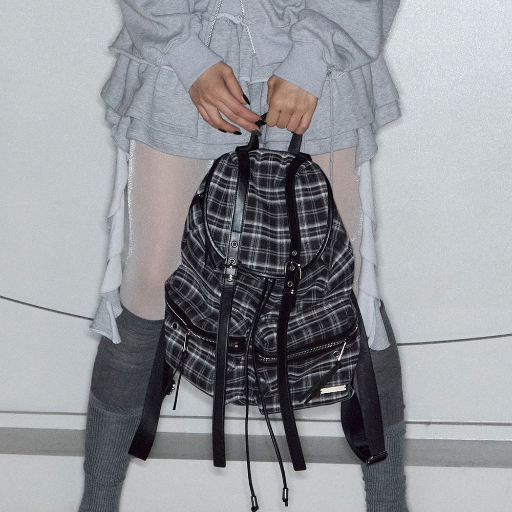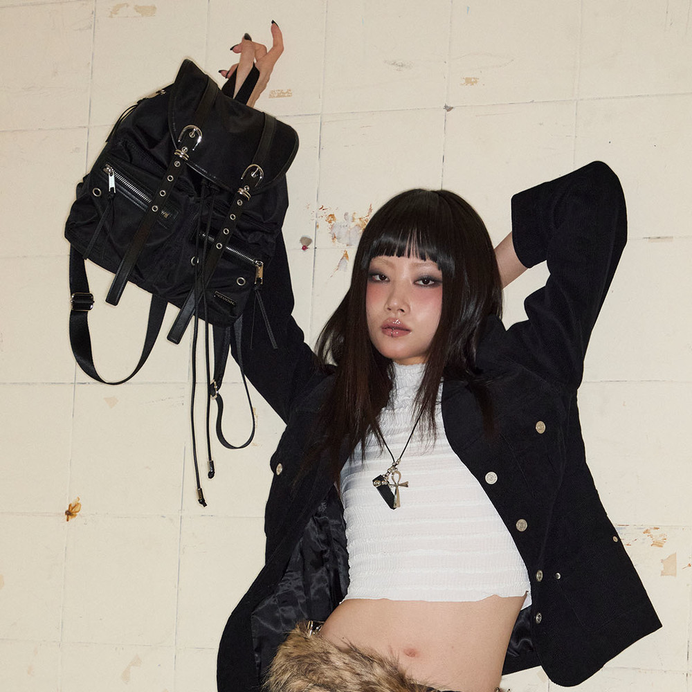 - 전면 고딕 톤온톤 프린트, 우측 사이드 셔링과 좌측 볼드한 레이스업 디테일 구성