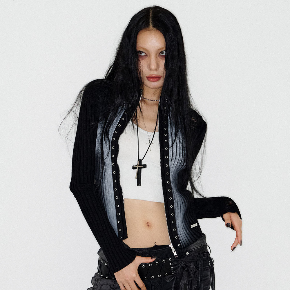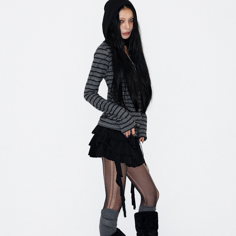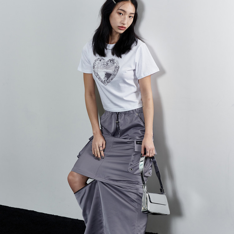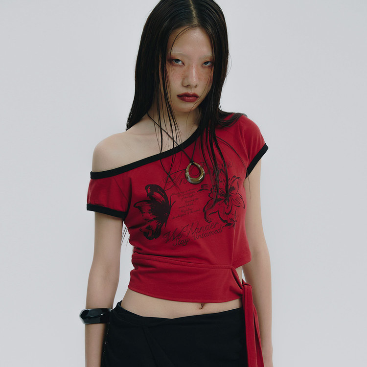 - 전면 고딕 톤온톤 프린트, 우측 사이드 셔링과 좌측 볼드한 레이스업 디테일 구성