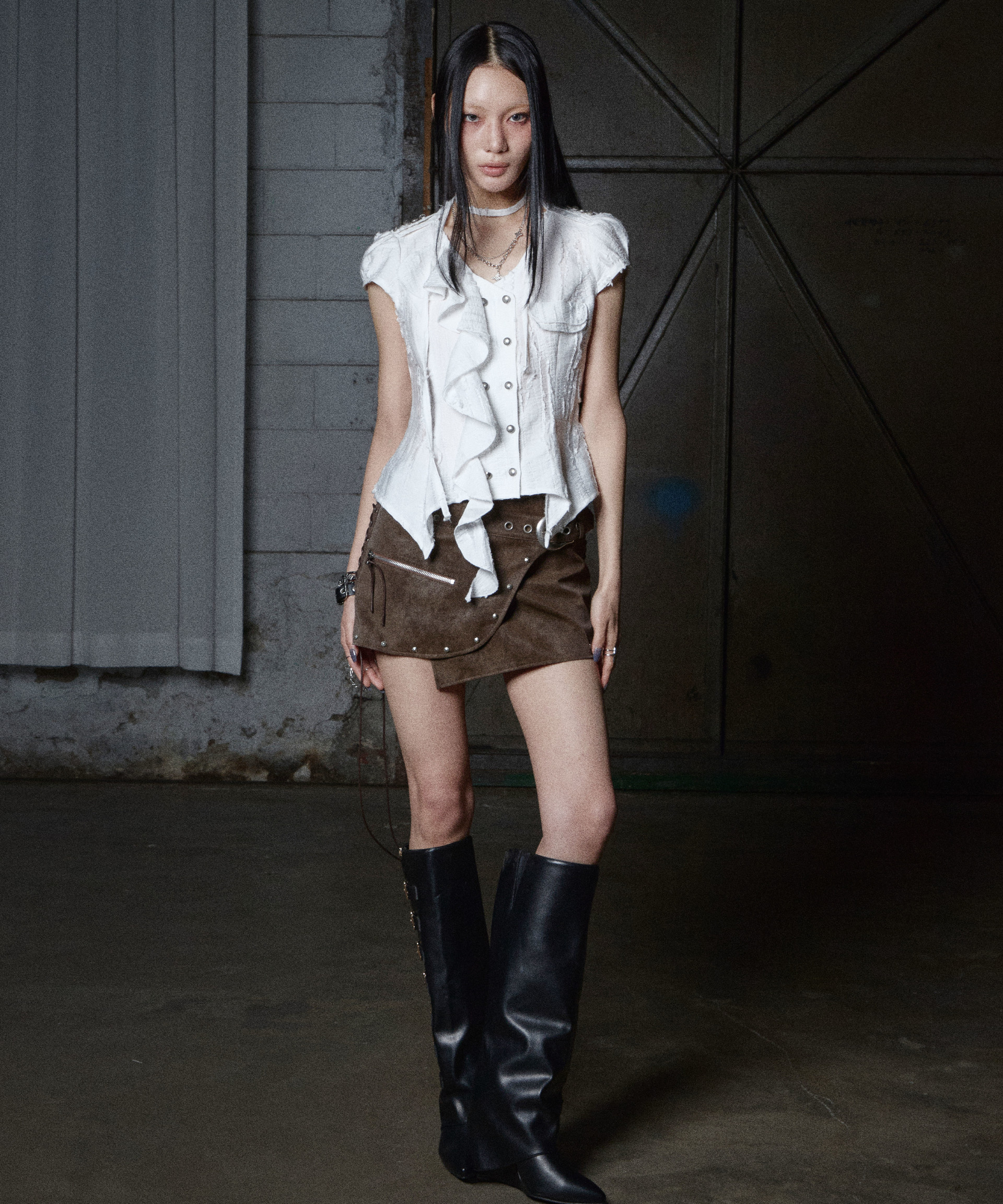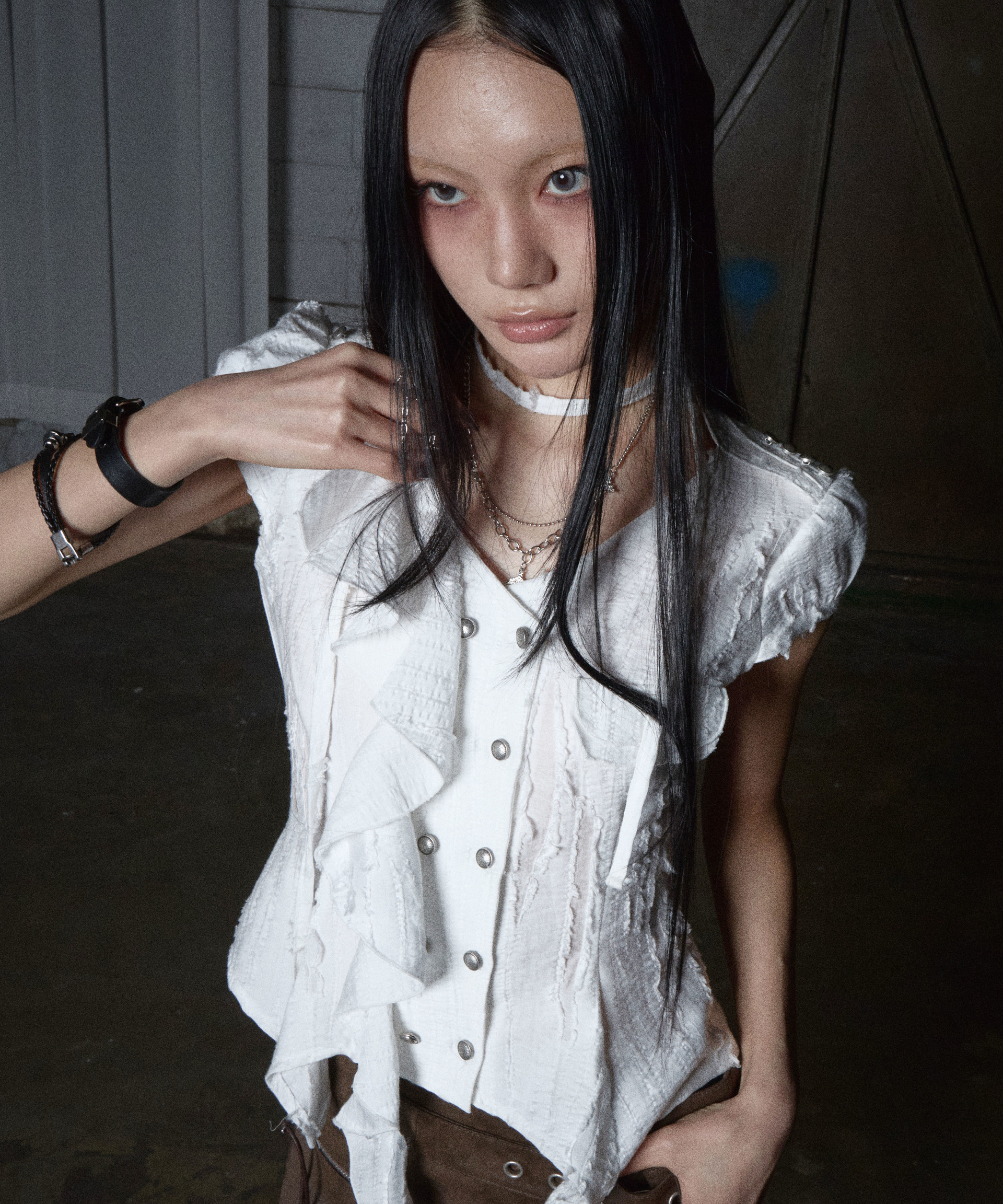 ✦ 그런지한 텍스처의 데미지 원단으로 제작된 더블 브레스트 블라우스