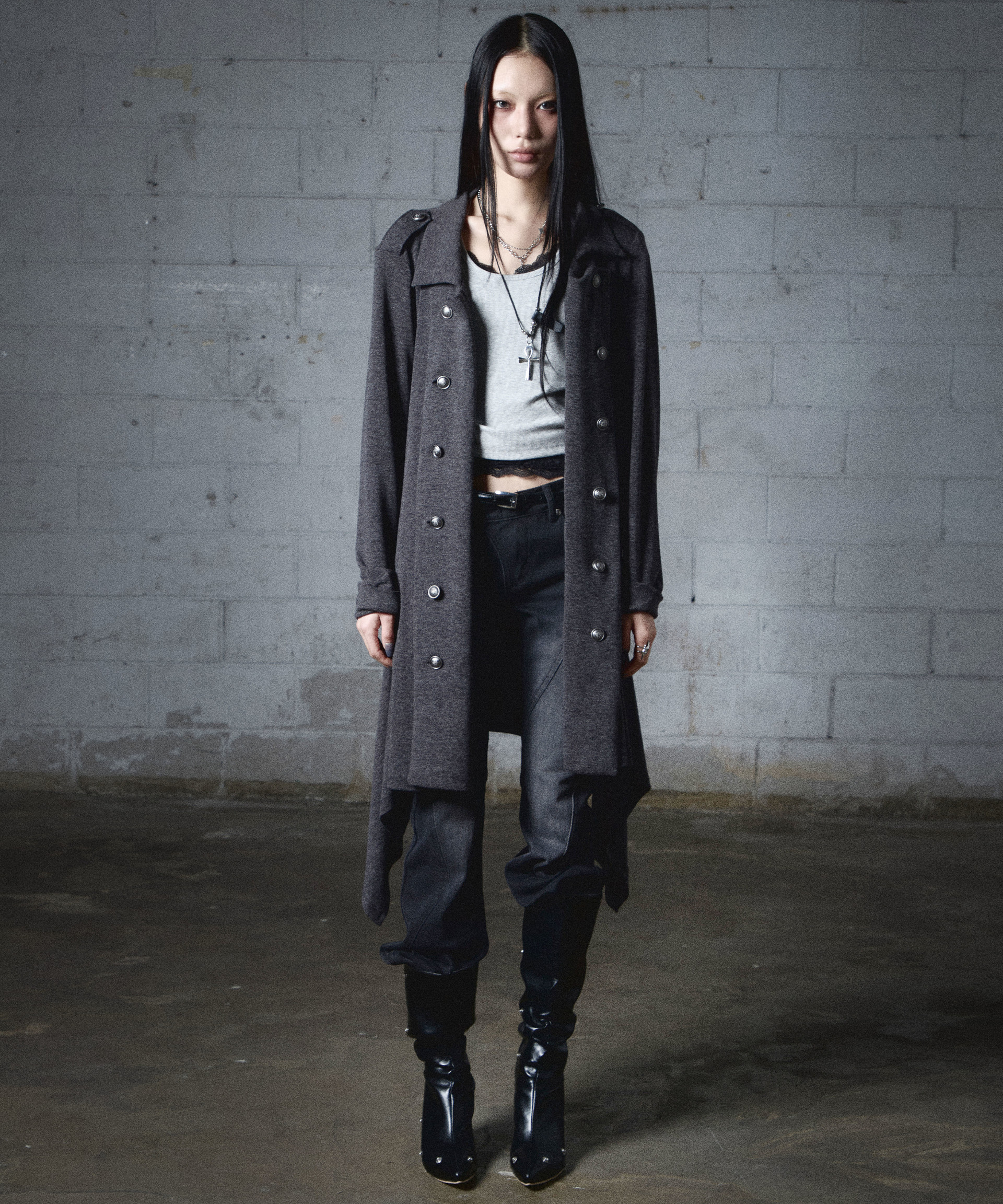 ✦ 사이드로 길게 떨어지는 별도 패널의 비대칭 헴라인으로 실루엣 강조