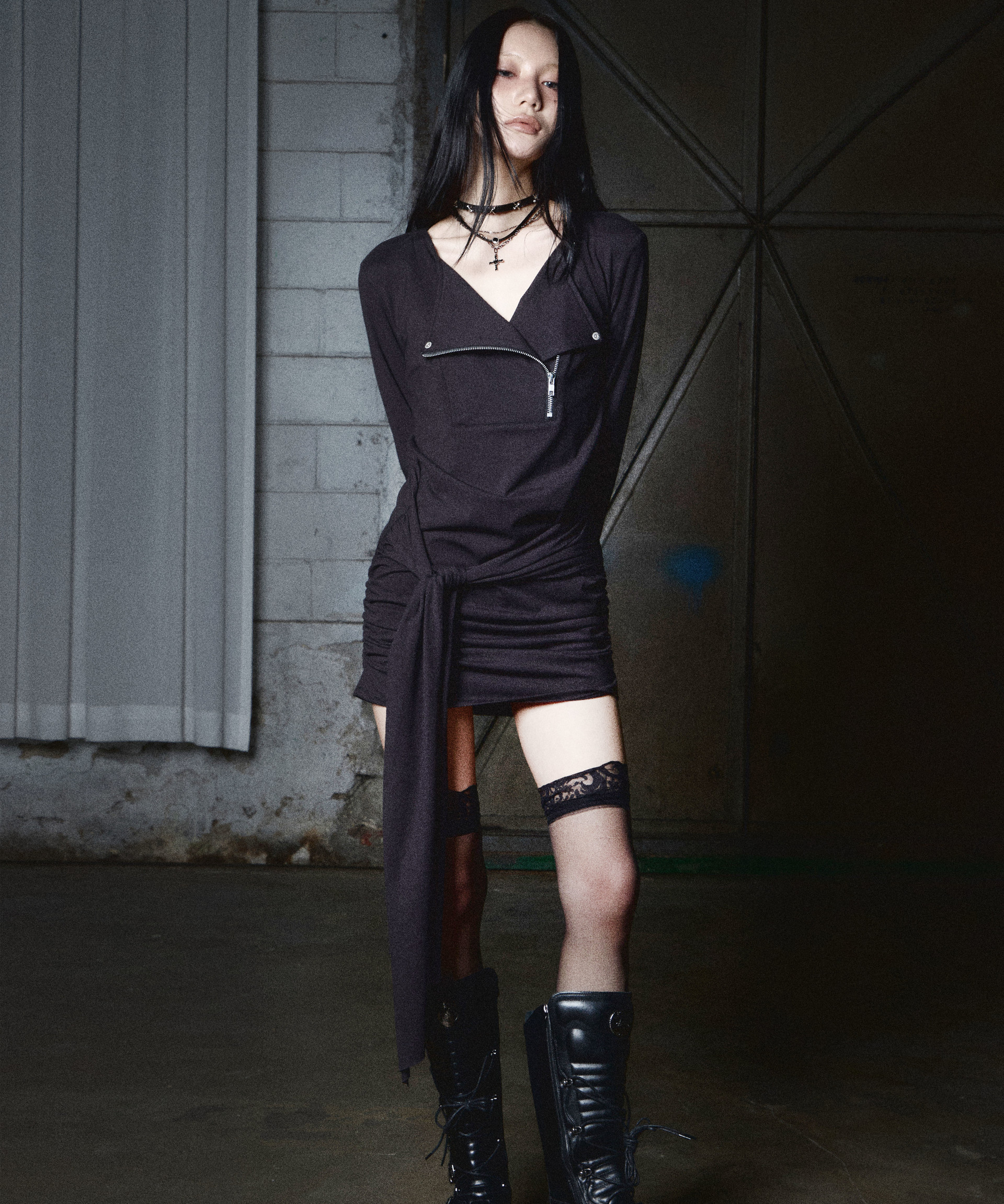 ✦ YKK 메탈 지퍼와 로고 스터드가 더해진 넥 구조로, 오픈 연출 시 라이더 라펠 실루엣 완성