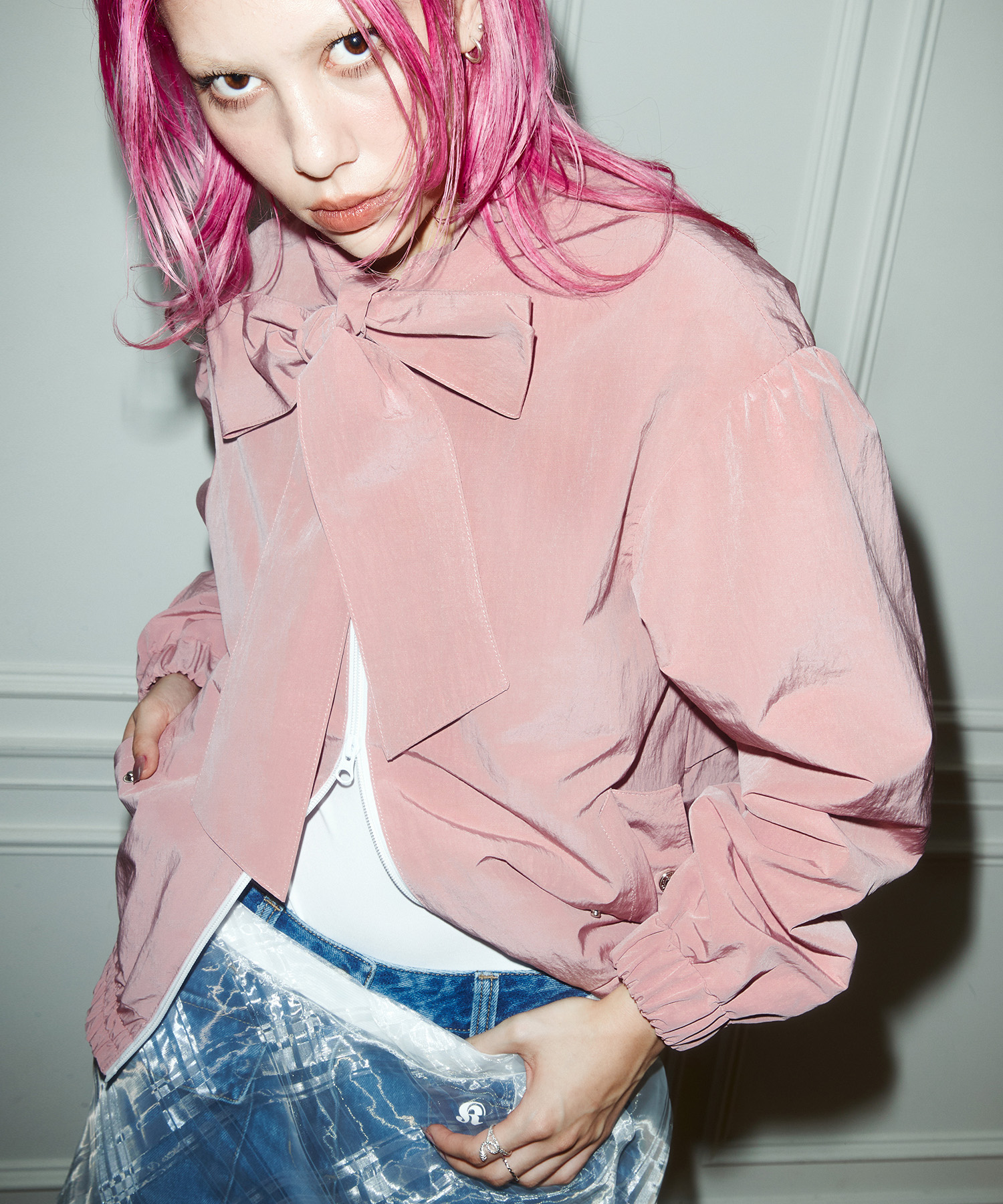나일론/폴리/코튼 혼방의 고밀도 원단을 사용한 리본넥 2way 집업 블루종 입니다.