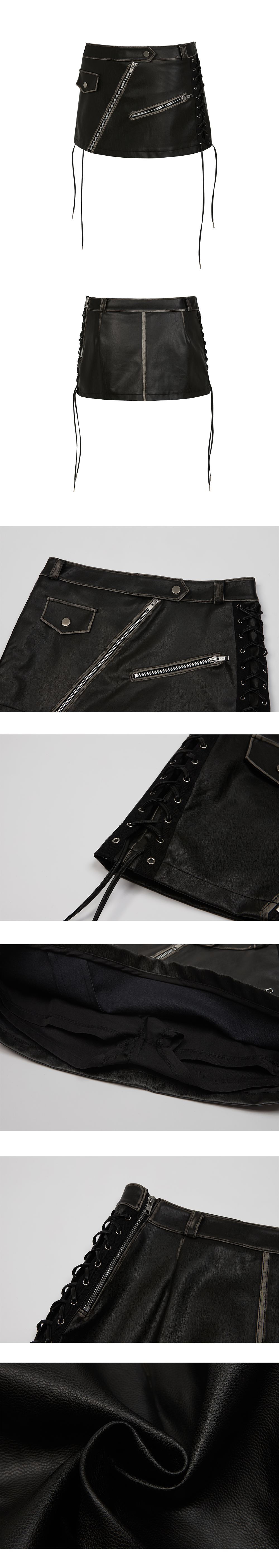 - 워시드(Washed) 비건 레더를 사용하여 제작한 모토 모티브의 미니 스커트 입니다.