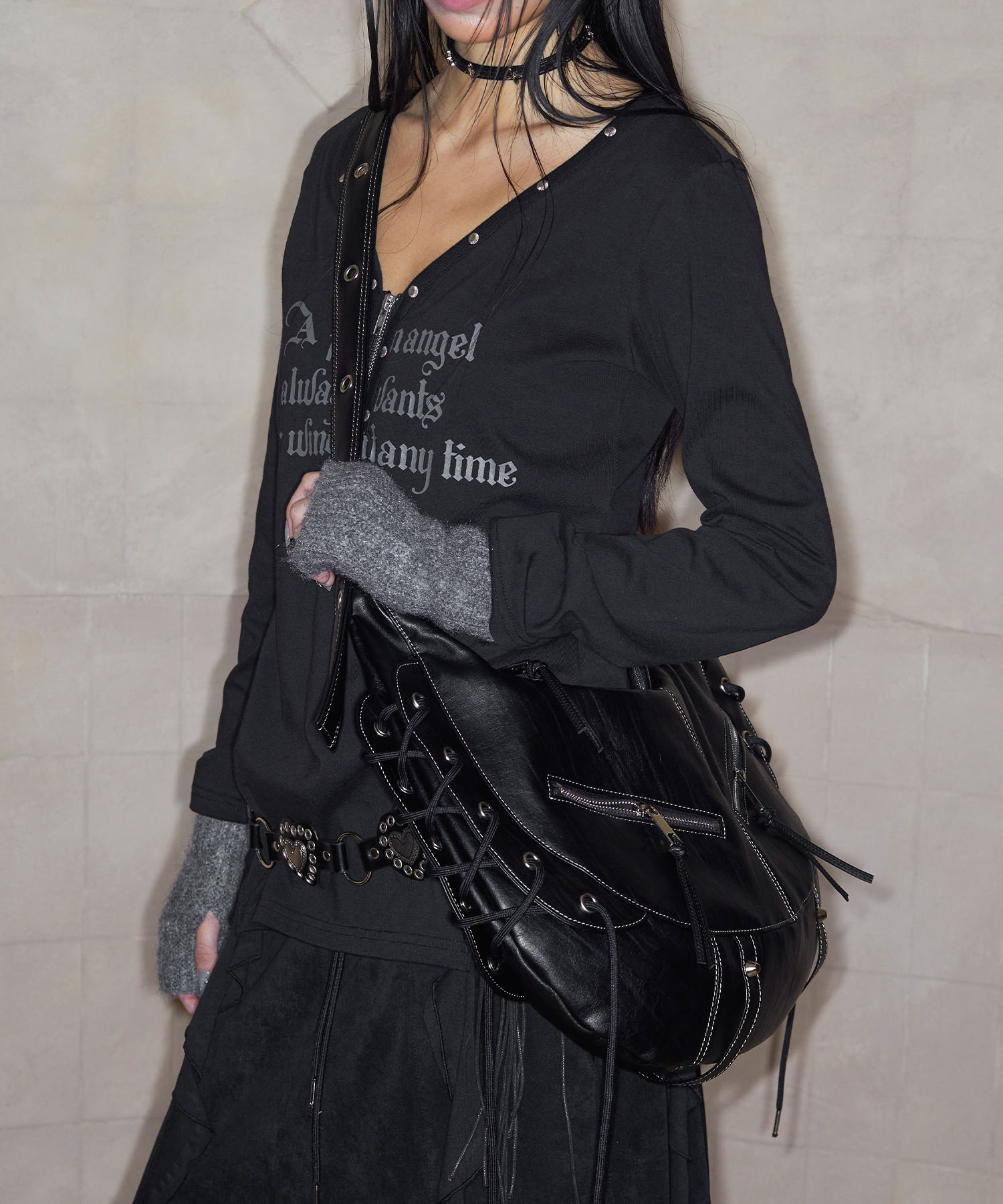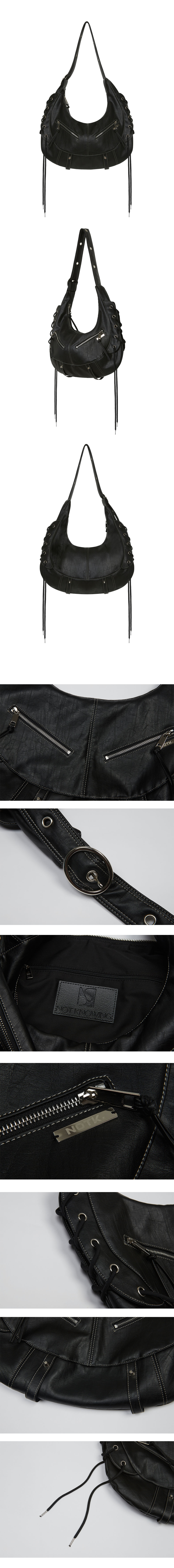- 숄더 스트랩 전체에 아일렛 장식과 볼드한 실버 O링 버클을 두어 벨트같은 무드를 주는 스트랩으로 디자인하였습니다.