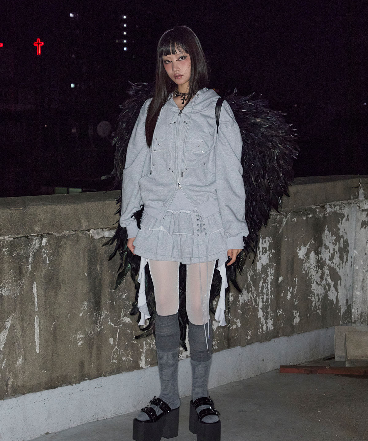 후드 엣지라인 따라 아일렛 장식에 스트링을 열은 레이스업으로 포인트