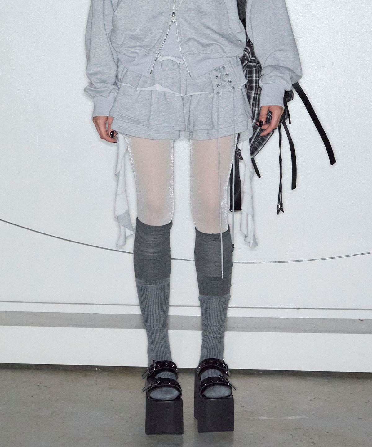 코튼 스웻 원단으로 제작된 3단 티어드 미니 스커트