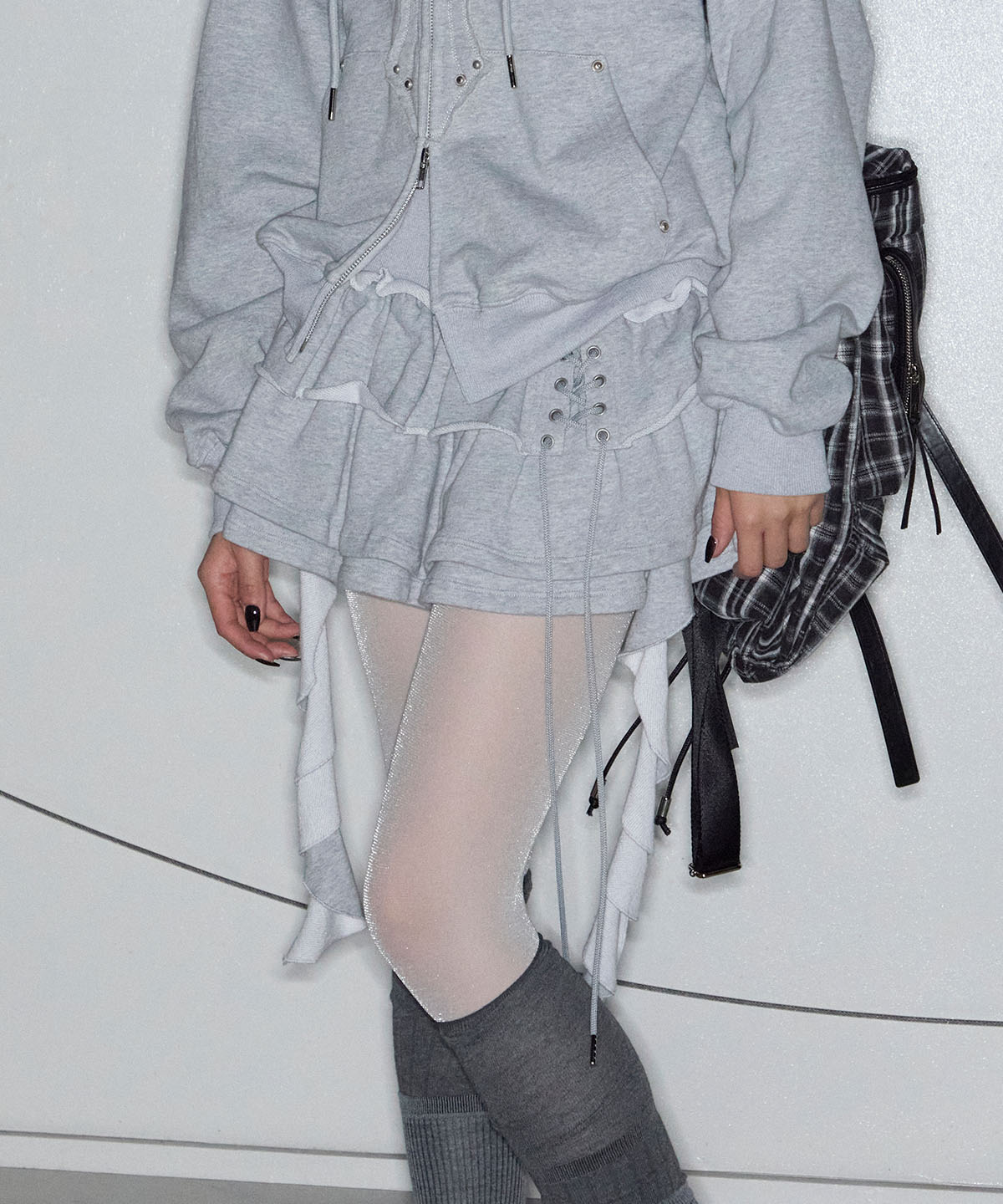 첫 번째 스커트 레이어에 아일렛 레이스업 디테일과 측면의 시그니처 러플 마무리