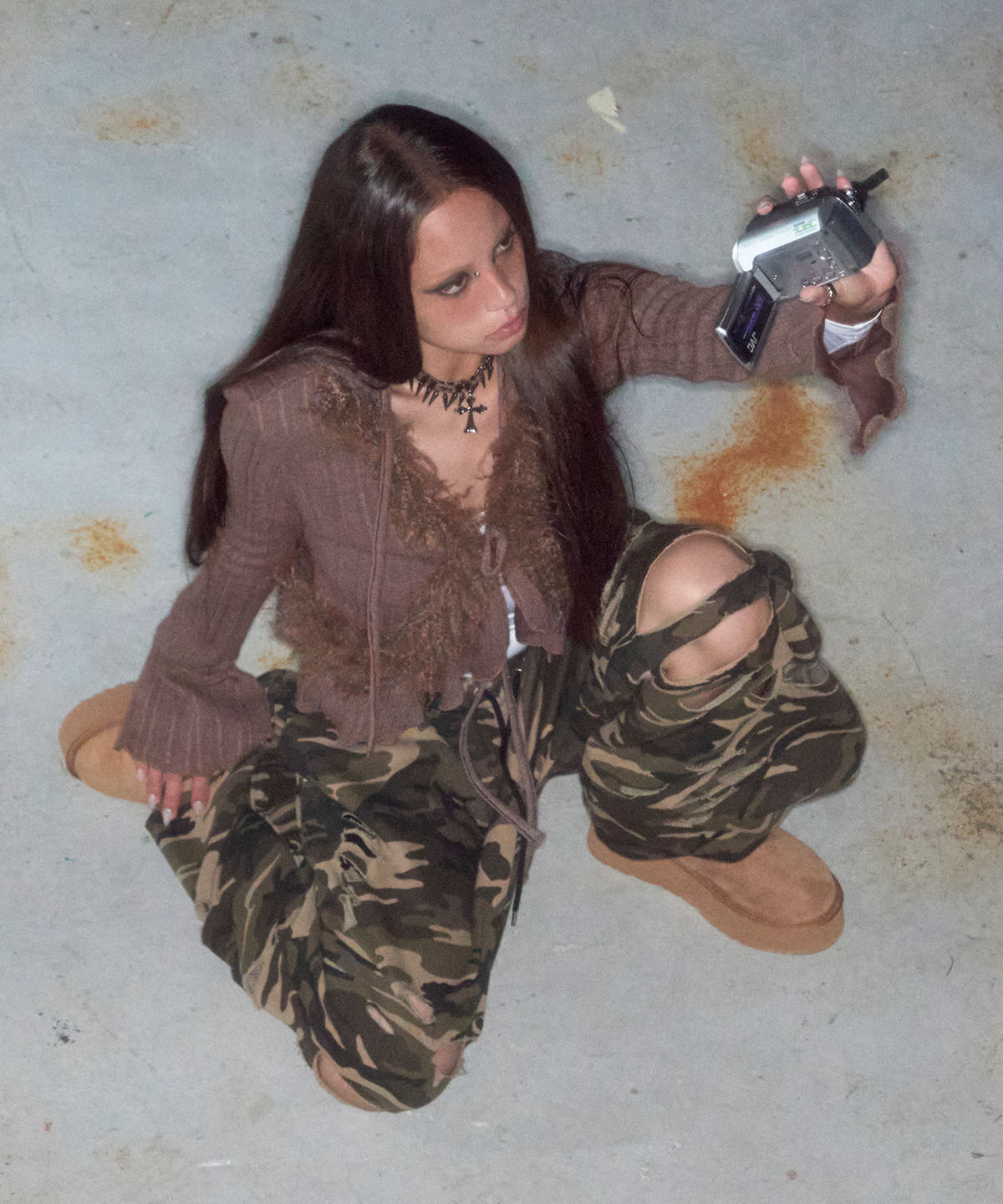 그런지한 긴 기장감의 헤어리 퍼 트리밍이 전면부터 뒷면 러플라인을 따라 디자인