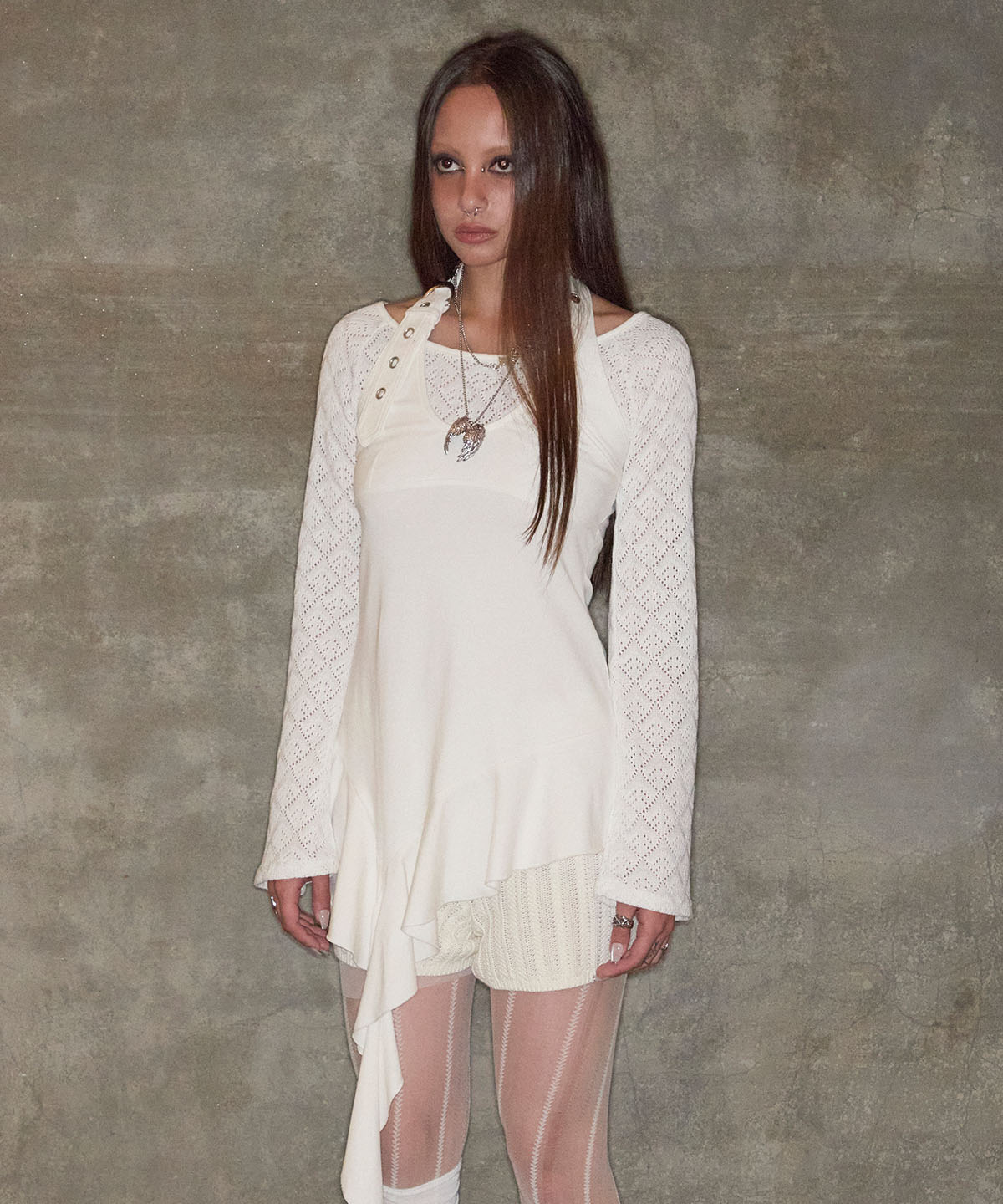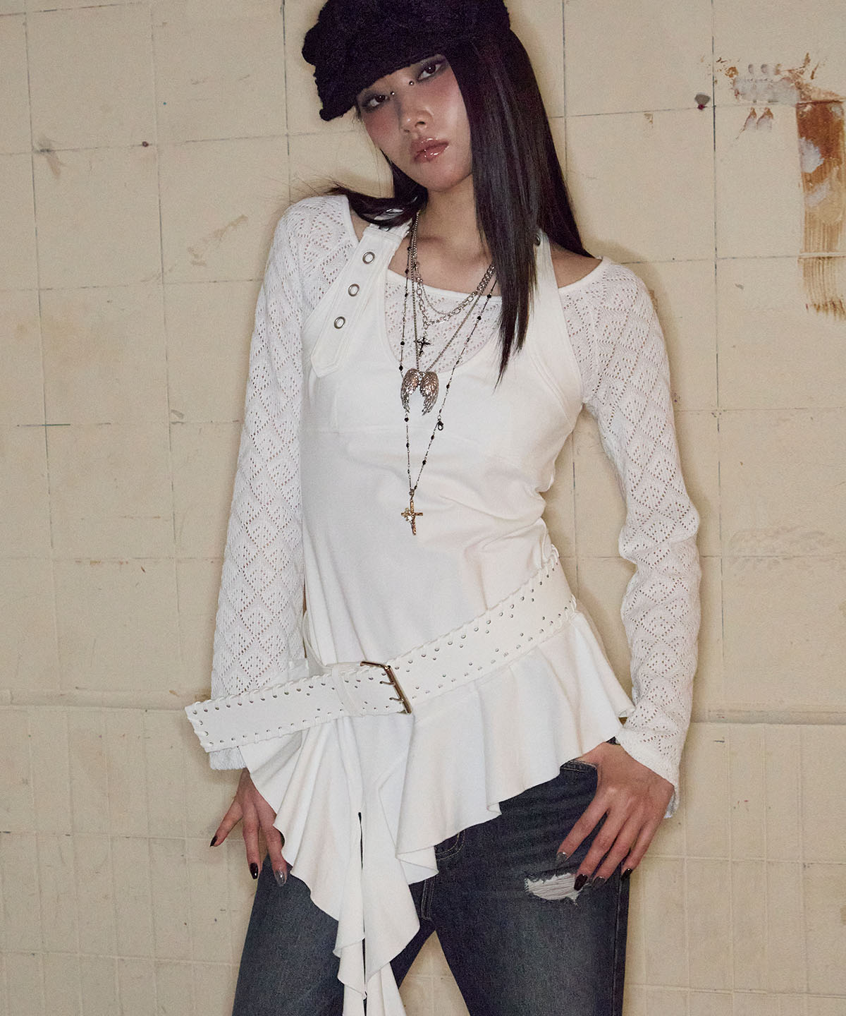 • 스트레치 코튼 원단과 크로셰 니트 원단을 조합하여 제작된 비대칭 롱슬리브 탑