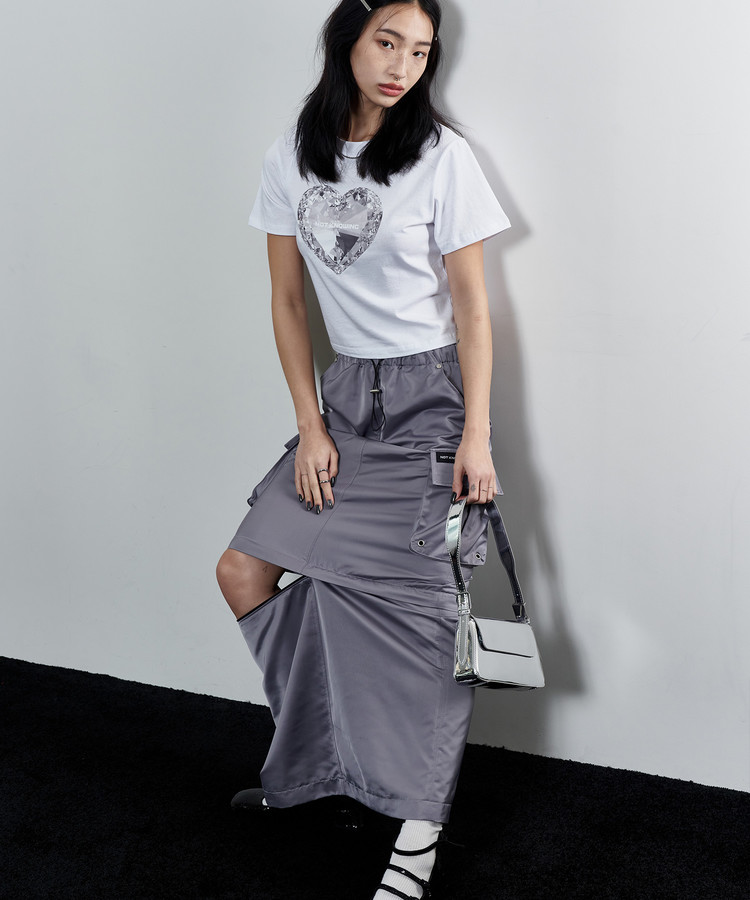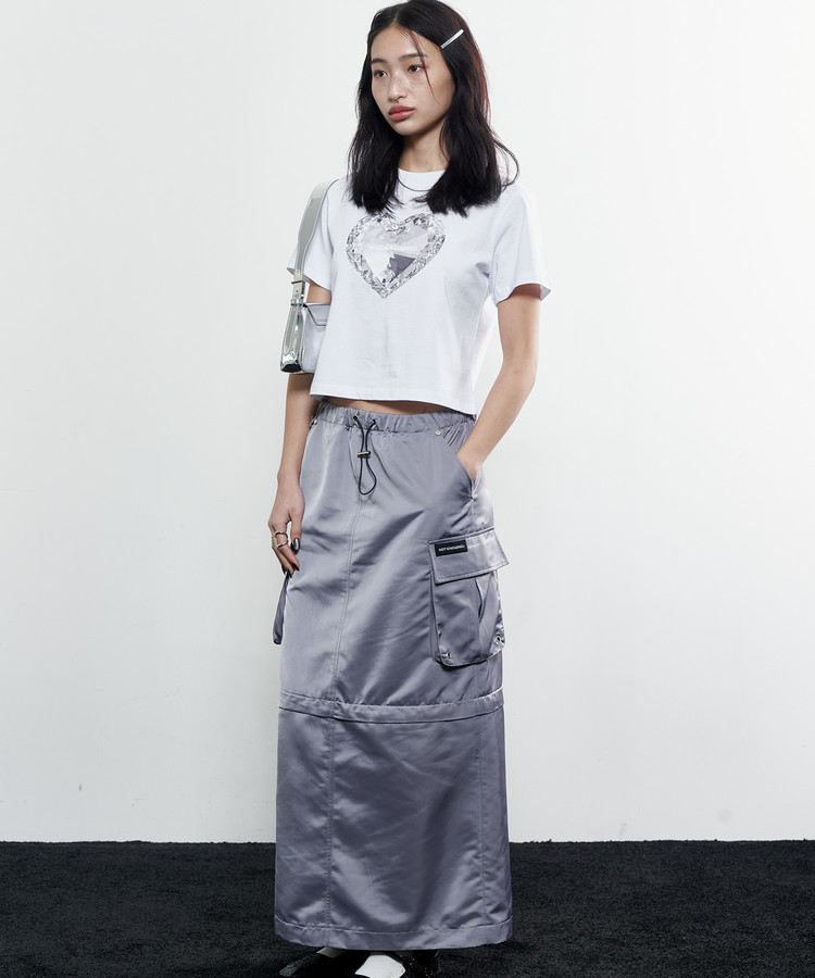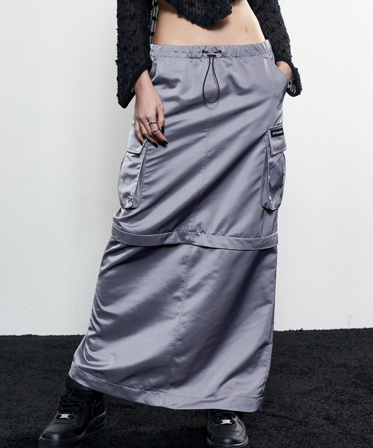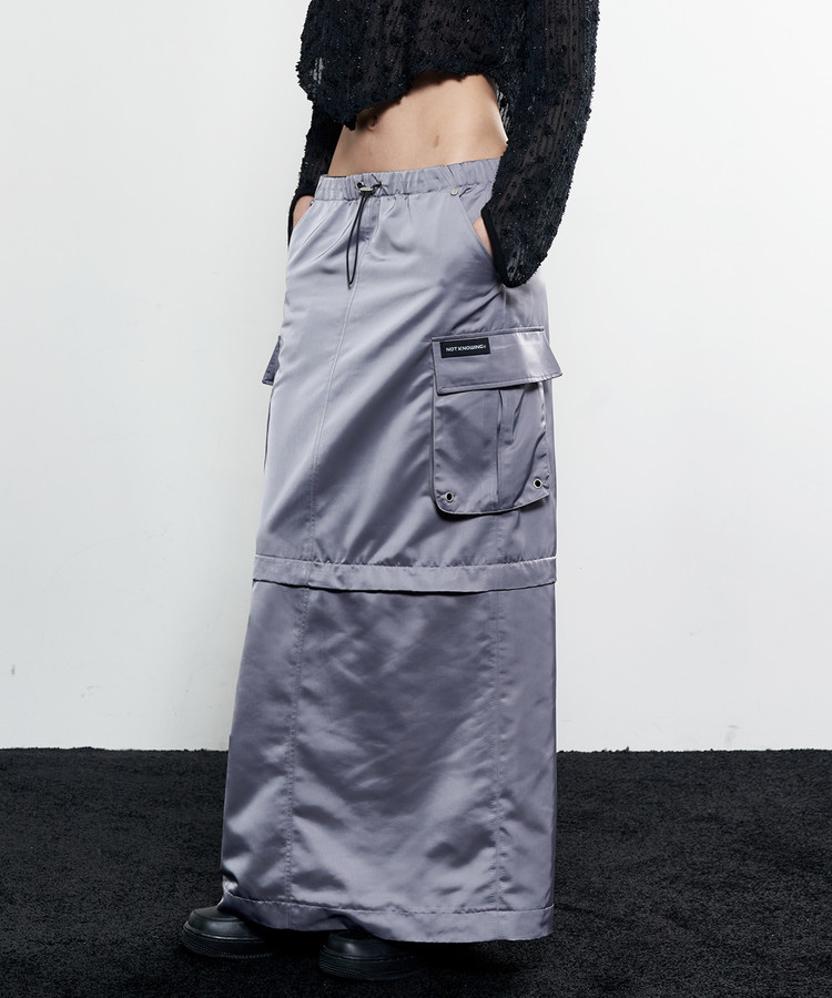 고밀도의 은은한 SATIN 원단을 사용한 Maxi & Mid 기장으로 조절이 가능한 2way 카고 스커트 입니다.중간의 히든 플라켓속의 지퍼를 통해 탈부착 하여 기장조절이 가능합니다.밑단은 탈착시에는 미디 기장의 카고 스커트로 연출이 가능하며 밑단을 부착시에는 발목까지 오는 롱한 기장감의 스커트 입니다.지퍼의 오픈 정도에 따라 트임 스커트로도 연출하실수 있으며, 탈착되는 밑단은 깊게 슬릿을 주어 활동성을 높였습니다.