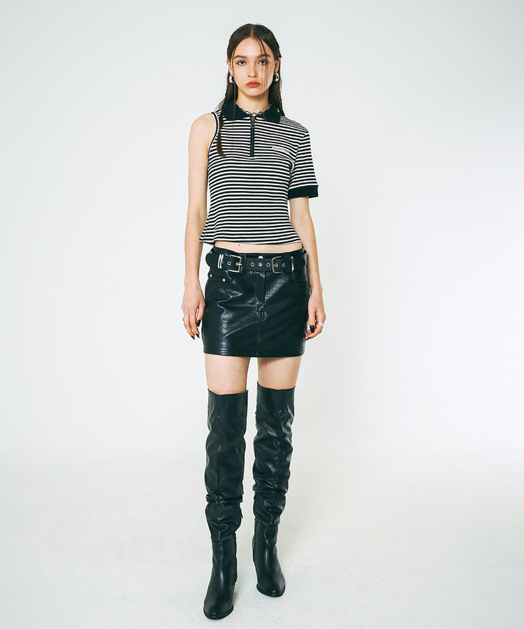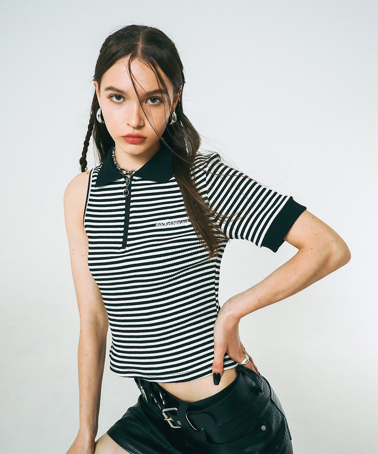 ∙블랙 스트라이프 컬러 RIB 원단을 사용한 컷아웃 슬리브리스 집업 카라 티셔츠 입니다.