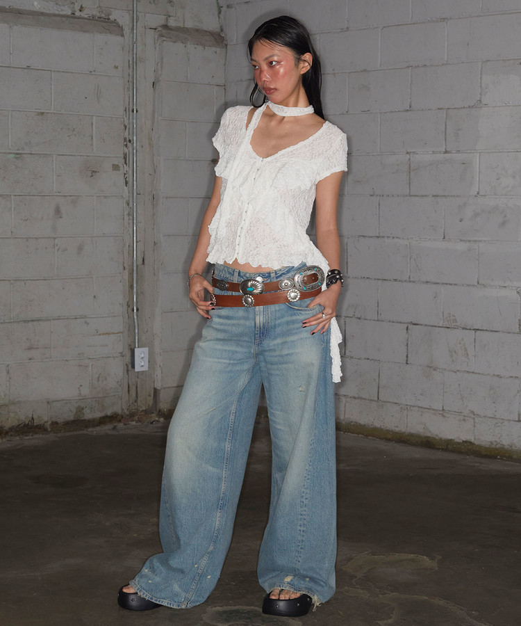 - 전면부 S라인 러플과 밑단 러플 디테일이 포인트로 착용시 그런지한 무드를 풍기도록 하였습니다.