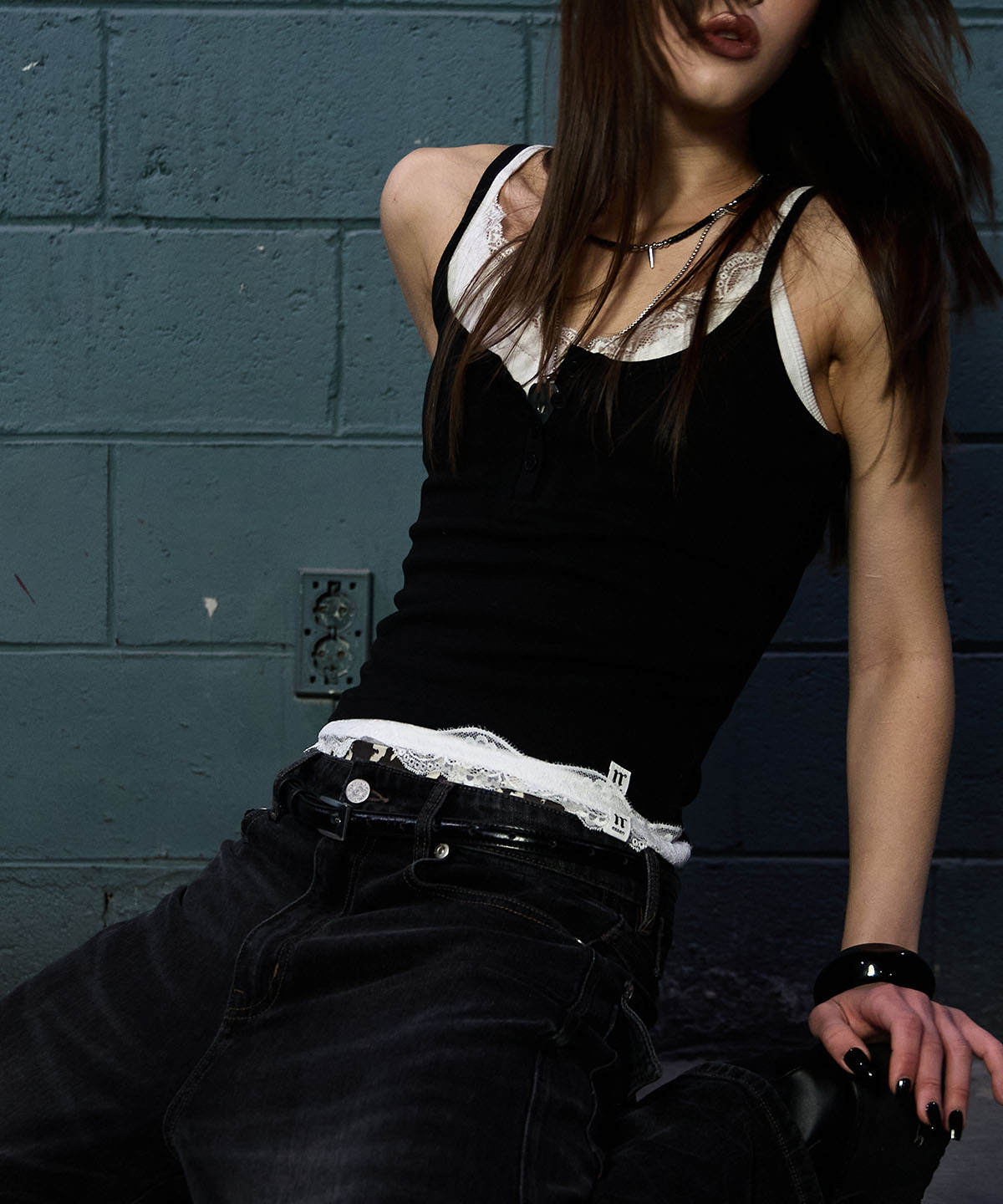 - 실켓 가공된 립 원단 캐미 넥 라인과 밑단으로 레이스 포인트가 있어 단독 착용 시에도 포인트